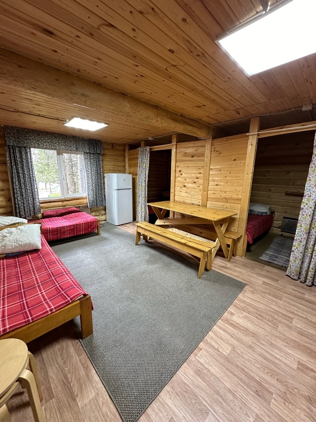 Две отдельные комнаты ( по 2 отдельные кровати), диван в холле, стол, лавка, чайник электрических, холодильник, умывальник